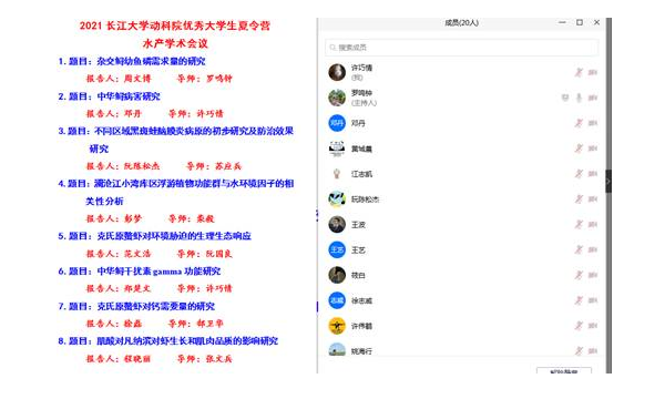 7月15日下午水产养殖学专业在罗鸣钟系主任组织下,周文博等8位研究生纷纷宣讲了自己目前研究取得的成果,网上员工讨论热烈。随后水产系老师和线上员工进行了深入的交流。