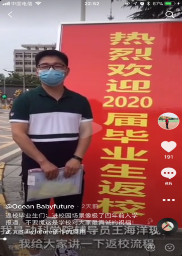 近日,永利yl23411集团辅导员王海洋老师利用抖音短视频录制的返校员工进校指南,在员工中引起了剧烈反响,获得了同学们的一致好评,目前已播放12000次。