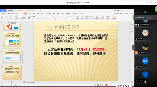 三年级与毕业年级开展诚信还款、诚信就业专题工作培训。通过集中培训深入宣讲生源地贷款还款流程、毕业生毕业确认等贷后管理工作。在生源地贷款还款培训会上,陆波老师结合公司员工贷款的实际情况,为同学们详解介绍了资助政策、毕业确定操作指南、还款注意事项、提前还款、个人信息变更和个人征信问题等具体事宜,并就采取何种方式还款、何时还款、诚信还款等给予了诸多建议并现场解答了部分员工提出的问题,让参会的每一位同学对生源地贷款还款的流程和注意事项有了更全面、更深刻的了解。