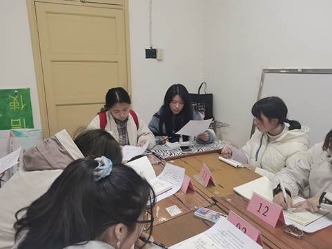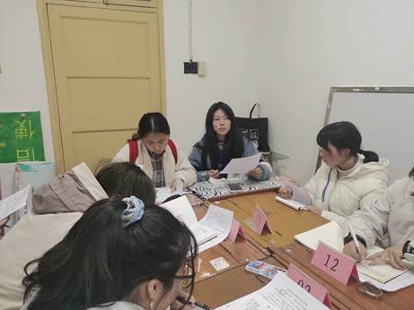 自由讨论环节中,乔欣蕊担任领导者和时间管理者的身份,归纳整理其他同学的观点,在规定时间内推动小组讨论的有序进行。该阶段,同学们就“领导层腐败和人事部无人管理哪个占主导地位”展开激烈讨论。最后,黄玲玲自荐进行总结陈述,她观点明确,逻辑清晰,采用总分总的方式向评委详细陈述小组的讨论结果。