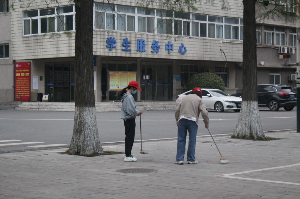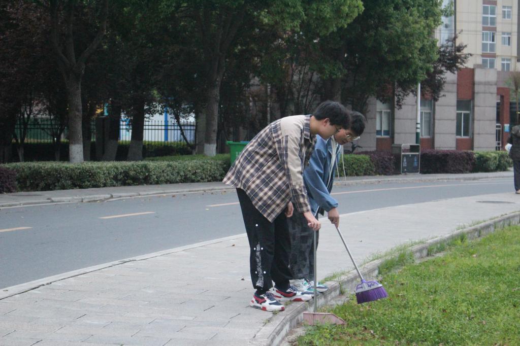 千里之行始于足下。组长刘雨双明确了大家的工作分工后,他们化身为校园志愿者,两两分为五组,同时在农科大楼、一教、二教、三教、六七教等区域进行垃圾清理。大家团结合作,不嫌脏、不怕累,挥起卫生工具,有的拿着扫把卖⼒地扫着,有的弯下腰,有的蹲在地上,认真清理角落的垃圾、杂物等。“校园是我们自己的家,清除垃圾杂物是我们应该做的事”这是每个志愿者们的⼼声。其中,李子文和马春林特别关注到草坪中的小纸团,细心打扫草丛中的白色垃圾。