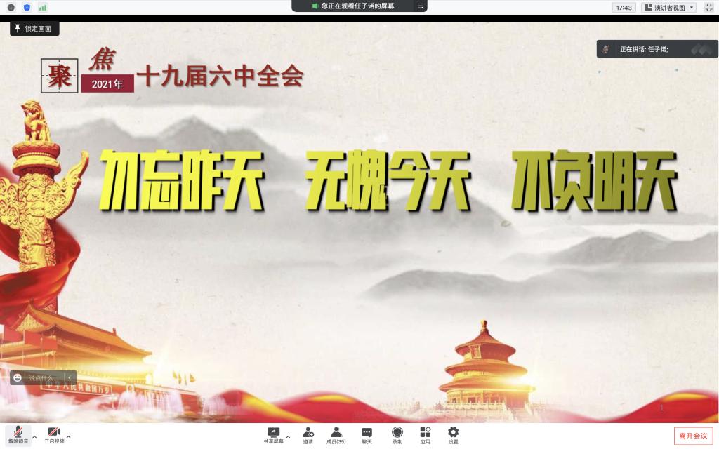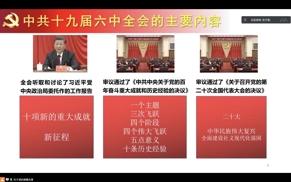 (通讯员:黄玲玲 吴广)4月21日中午2时,永利yl23411集团在线上开展以“勿忘昨天,无愧今天,不负明天”为主题的中共十九届六中全会相关内容的学习活动。参与本次活动的有:永利yl23411集团青马学习小组全体成员、20级与21级各班的团支书以及20级的预备党员。本次活动由学习科创部部长任子诺担任主讲人,同时还邀请到了团委书记王海洋老师。