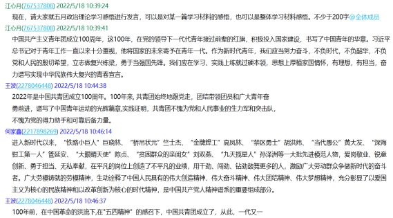通过班会集中组织同学们学习“习近平在中国人民大学考察时强调 坚持党的领导 传承红色基因 扎根中国大地 走出一条建设中国特色世界一流大学新路”、“习近平主持中共中央政治局常务委员会会议 分析当前新冠肺炎疫情防控形势 研究部署抓紧抓实防控重点工作”、“习近平给北京科技大学老教授的回信、致首届全民阅读大会举办的贺信、致首届大国工匠创新交流大会的贺信、给中国航天科技集团空间站建造青年团队的回信”、“习近平在庆祝中国共青团成立100周年大会上的重要讲话”、“弘扬劳模精神 发挥劳模作用——论中国共产党人的精神谱系之十九”等文件精神。其次,同学们利用课余时间加深学习,并对学习内容做出自己的心得体会。
