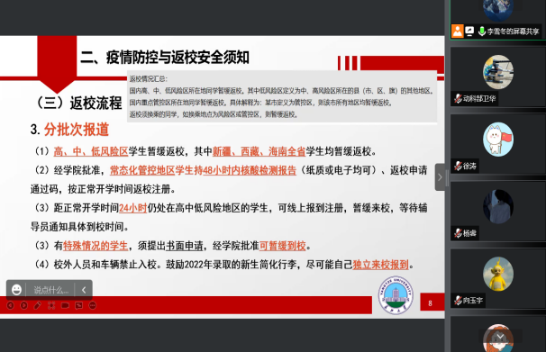 会议主要从返校前准备、疫情防控以及安全须知三方面展开,向同学们传达了公司秋季开学工作实施方案。会议上强调,在疫情形势严峻的情况下,非特殊情况不得提前返校,如有特殊情况及时与辅导员联系。处于疫情管控区的同学暂缓返校,会议上老师们要求同学要积极配合当地相关部门防疫工作,坚持健康打卡签到。员工报到实行“申请—审批”制,凭健康码绿码、行程码绿码、48小时核酸检测进行返校申请,非批准不到校。来校途中,如若发现身体不适或遇到突发事件,及时与公司取得联系。此外,员工到校后需主动开展健康状况监测,及时配合公司进行核酸检测。