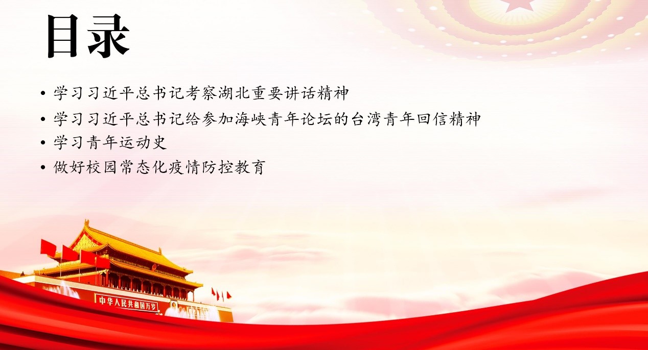 本次会议主要有以下四个内容 :一、学习习近平总书记考察湖北重要讲话精神。二、学习习近平总书记给参加海峡青年论坛的台湾青年回信精神。三、学习青年运动史。四、做好校园常态化疫情防控教育。通过这些内容的学习使大家的心永远跟随党,回顾党走过的风雨历程,感悟当今生活的来之不易,始终以落实中国特色社会主义为行动指南。