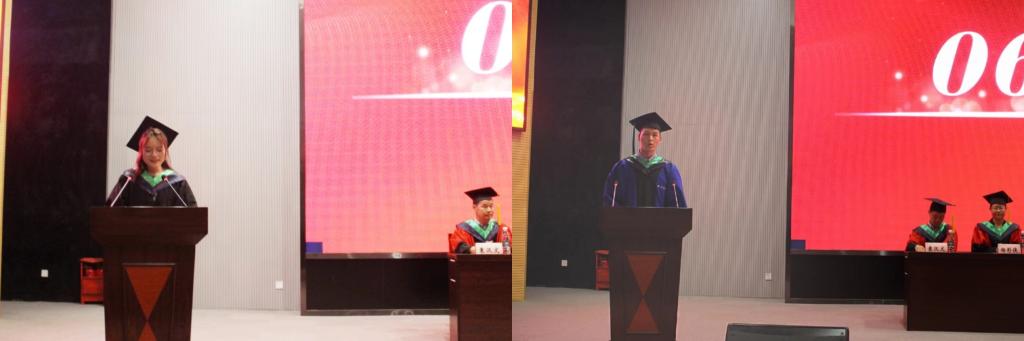 本科生代表王珊珊用三个“L”,即learn(聆听)、limit(不设限)、love(仁爱)讲述了自己大学奋斗、拼搏、坚守的经历,并祝愿全体毕业生当如江河汇入大海,如繁星闪烁般,身影缀满神州大地,各自灿烂;研究生代表陈旺对老师们的悉心栽培和同学们的陪伴鼓励表示真挚的感谢,分享了自己在永利yl23411集团官网七年时光里从进实验室的无从下手到顺利考上中山大学博士研究生的成长路程,激励各位同学要铭记“长大长新”的校训,不畏艰险、追求卓越、敢为人先。