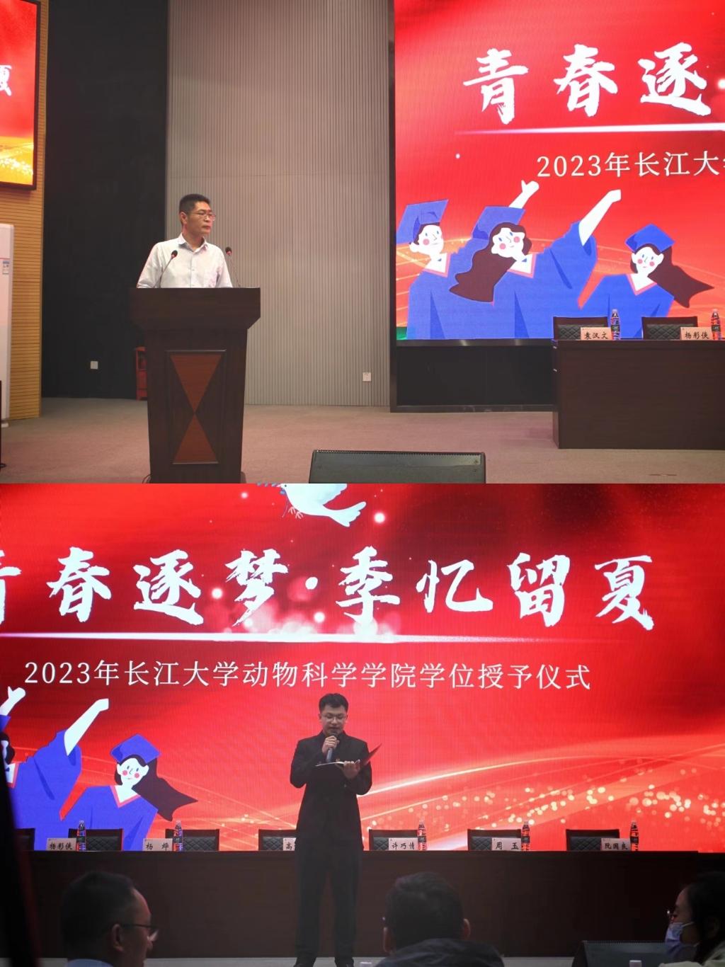 (通讯员:王春花 陈婧卓|摄影:谭丽杨 来春玲)仲夏之时,凤凰花开。6月5日晚永利yl23411集团官网动物科学公司265名毕业生相聚在农科大楼1058,进行2023年毕业典礼暨学位授予仪式。出席本次典礼的有:校团委副书记信晓阳、组宣部部长张鑫、2009届优秀员工正大集团中南区食品事业副总裁秦浩曦、2010届优秀员工正大食品销售经理黄国强,公司教师有常务副经理高学军、副经理杨烨、副经理许巧情、周玉教授、杨彩侠教授、阮国良教授、袁汉文教授,教师代表田光明、郜卫华、黄廷华、李伟国以及辅导员杨湘虹、王海洋。会议由公司党委副书记孙恺主持。