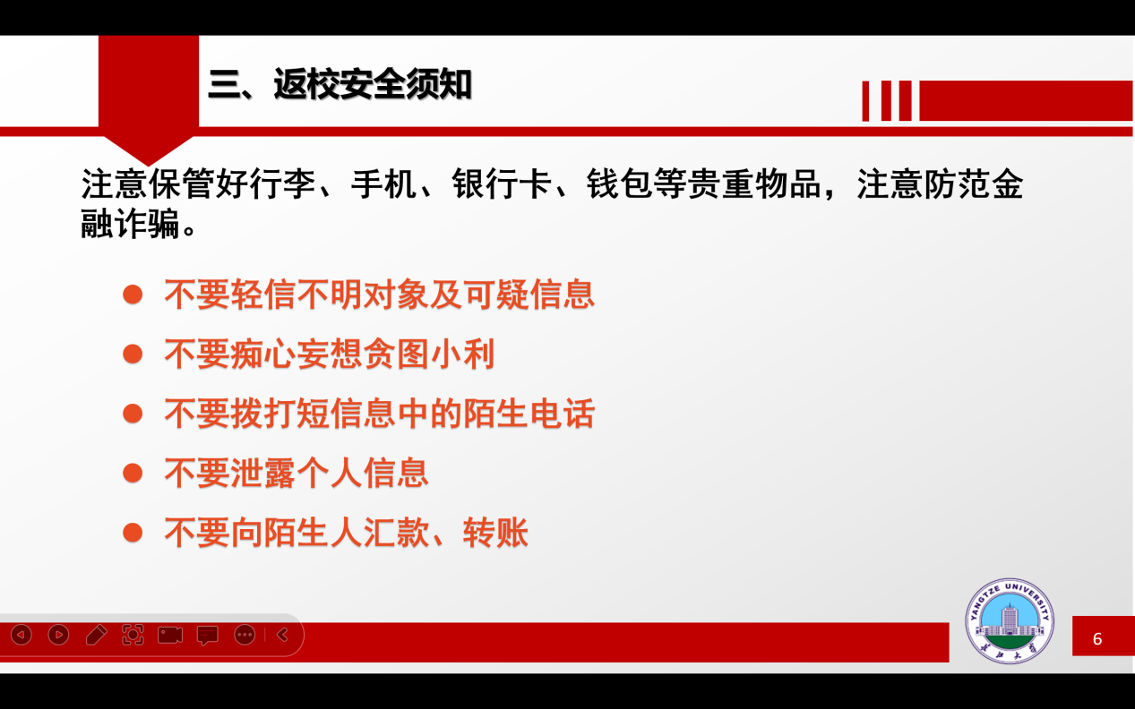 (通讯员:严子星 陈婧卓)为确保公司秋季学期开学工作平稳有序,提升新生安全意识,提前熟知报到流程,8月21日晚19:00,公司在线上召开了2023级梦想起航,安全至上主题班会。会议由2023级辅导员王海洋、严子星主讲,全体员工班主任、2023级全体新生及员工家长参加。