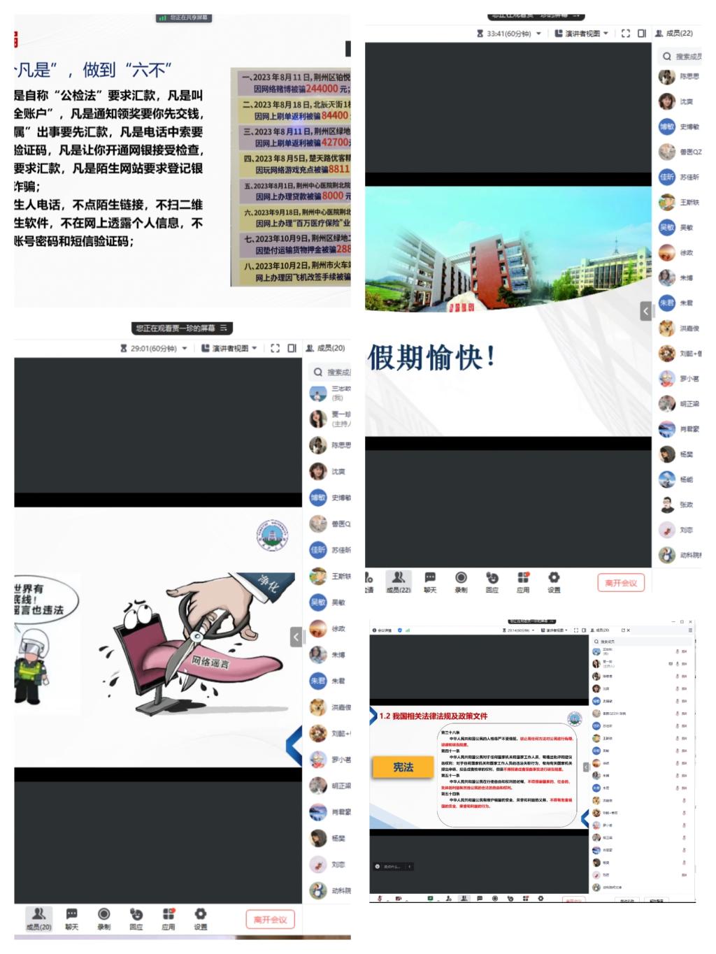 五一假期将至,为确保研究生度过一个安全、愉快的假期,按照研工部、公司部署,研究生以班级为单位通过线上线下相结合的方式开展了安全教育主题班会。 此次班会内容丰富,涉及交通安全、食品安全、网络安全等多个方面,通过案例分析和专家讲解视频,让同学们深刻认识到安全的重要性。研究生辅导员王婷特别强调了假期期间的安全注意事项,提醒同学们遵守法律法规,注意个人财物安全。 此次线上安全教育主题班会的开展,有效提升了同学们的安全意识和自我保护能力,为营造平安和谐的校园环境奠定了坚实基础。 (审核 苏应兵|编辑 罗婧雪 王婷)