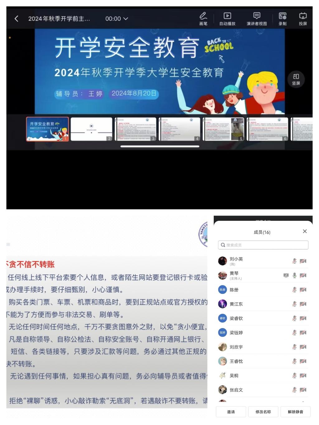 班会内容涵盖了校园安全的多个方面,包括但不限于实验室安全、网络安全、心理健康和日常生活安全。通过一系列的教育和讨论,研究生们被提醒在学习和生活中要注意潜在的安全风险,并掌握基本的自我保护措施。